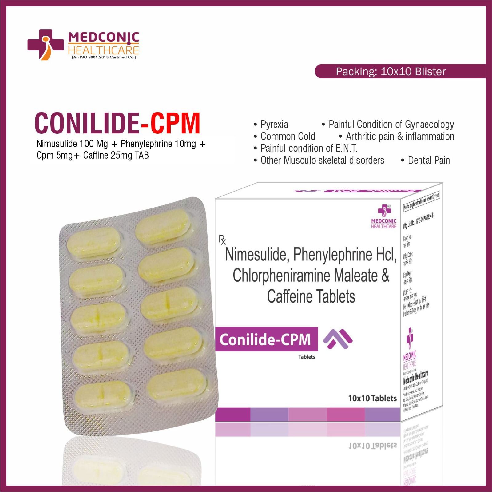 CompositionNIMUSULIDE 100 MG PHENYLEPHRINE 10 MG CPM 5 MG CAFFINE 30 MGPackage Size10*10